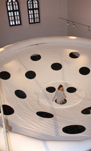 Momentálně probíhající výstava Kateřiny Vincourové představuje velkorozměrnou nafukovací bílou strukturu, jež zprostředkovává nový akt poslechu.