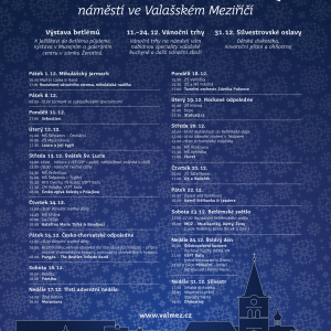 Město Valašské Meziříčí vás srdečně zve na Vánoce ve Valmezu, nejkouzelnější období roku. Město se oblékne do adventního a vánoční atmosféra na náměstí potěší každého návštěvníka. Přijďte se podívat a nadechnout se příjemné sváteční atmosféry s bohatým doprovodným programem.